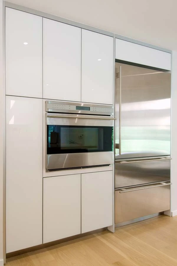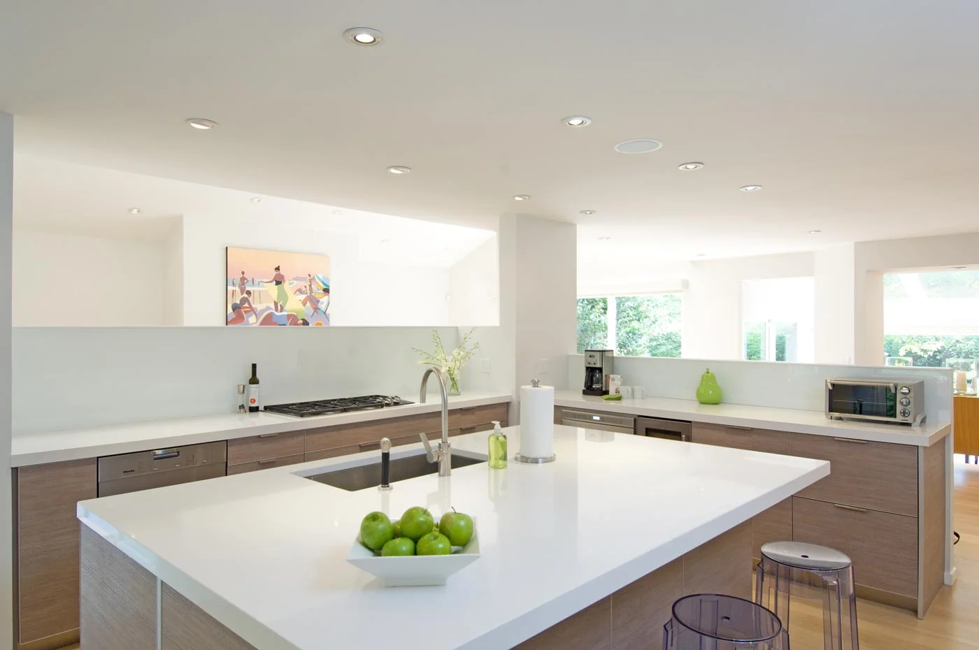 We brought this kitchen from tomb-like to open-concept by extracting unnecessary walls and elevating the entire space. The result is a wonderfully light, expansive feel, with a minimal design, delivering a sense of order and utilitarianism. Featured is a Dornbracht faucet, wine cooler, glass-doored pantry, wood veneer cabinets, and ghost stools.