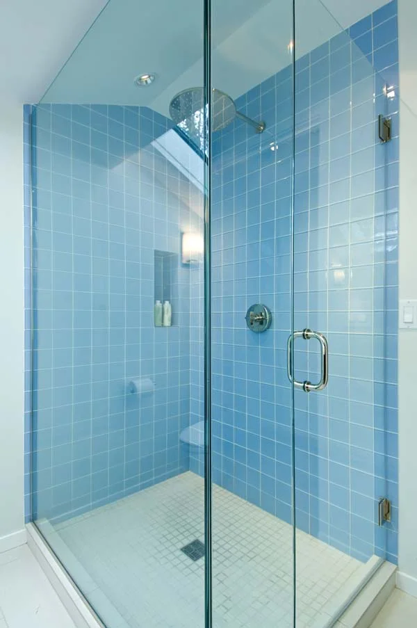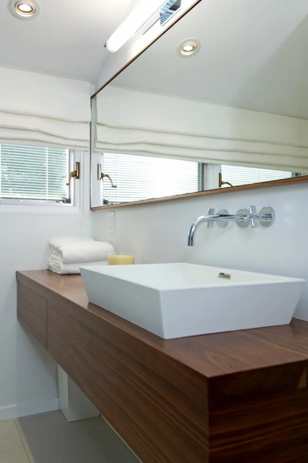 Sink countertops are custom made with a beautiful walnut wood and finish. All mirrors are also custom wrapped with a walnut wood to match. Blue waterworks glass tile in shower, glass enclosure